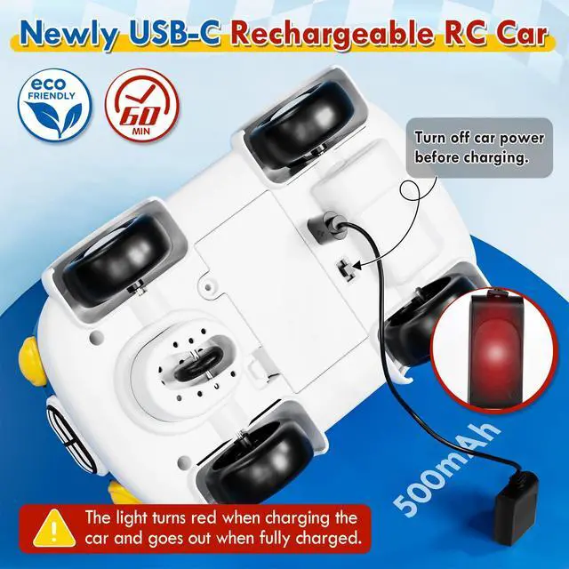 Uninterrupted Playtime: Keep the fun going with USB-C rechargeable cars and easy-to-use remotes requiring just 2 batteries. Say goodbye to battery waste. (Tips: Charge before first use; indicator turns off when fully charged. Turn off the car body power while charging.)