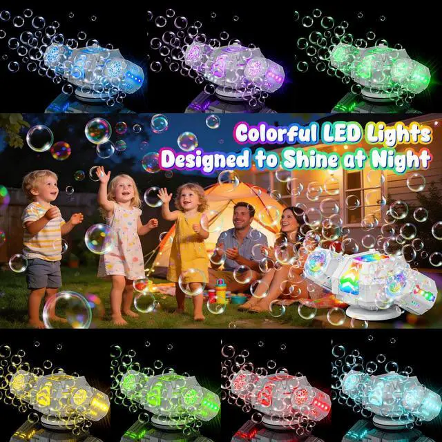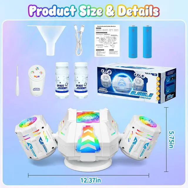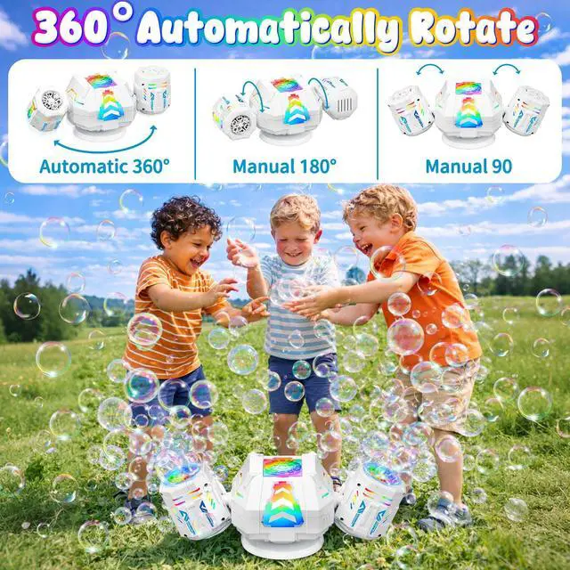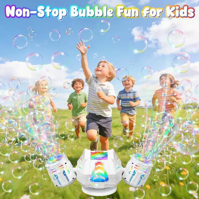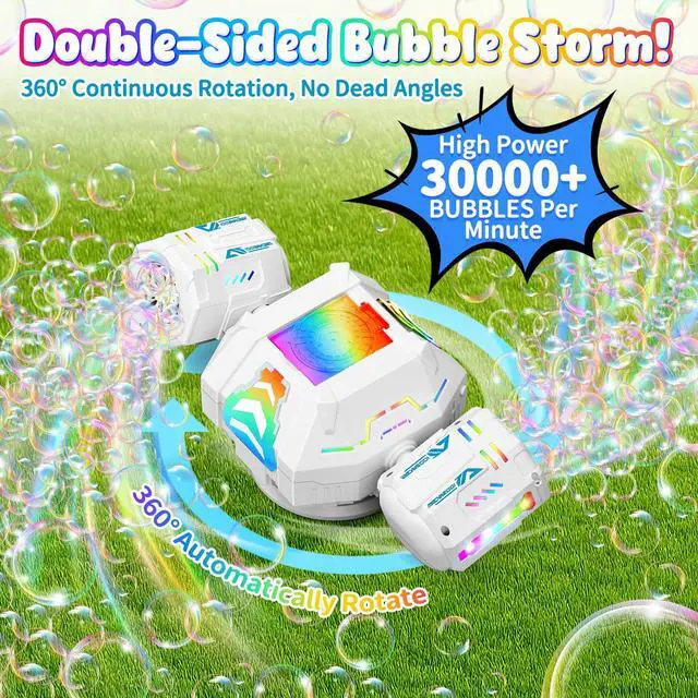 Upgraded Mecha-Style 360° Dual-Head Bubble Machine: This big bubble machine features a creative and cool futuristic mecha design, making it stand out from ordinary styles. Equipped with a dual-head 6-hole cyclic bubble system and large nozzles, bubble maker produces over 30000+ giant bubbles per minute for a full, eye-catching effect. Paired with 360° dual-speed automatic rotation and 180° adjustable arms, bubble maker easily covers every corner. Perfect for parties, weddings, and outdoor events
