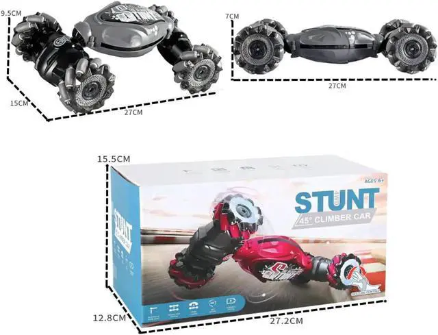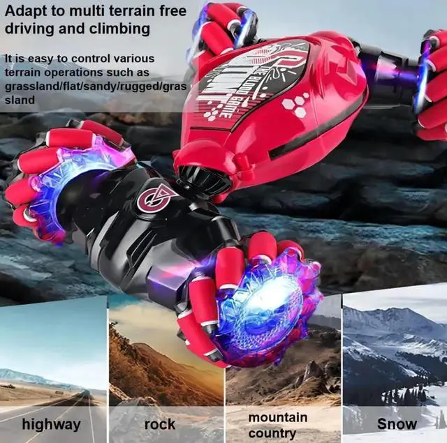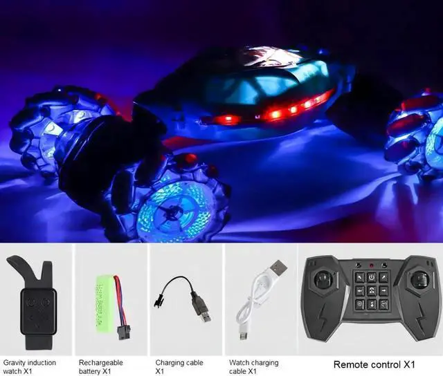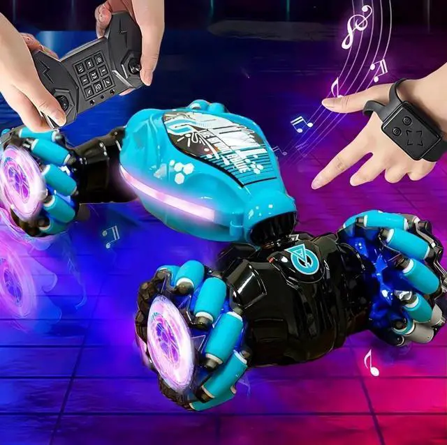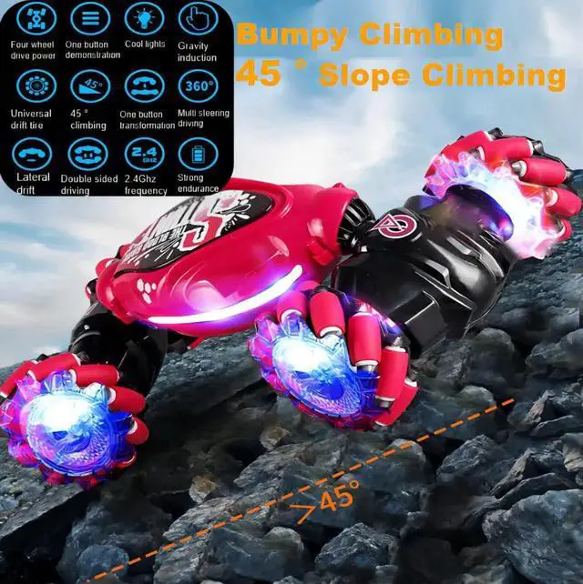 Amazing Gesture Sensing Stunt Carstunt remote control car combines many functions in one, e. g. dazzling colorful lighting and music effects, on-road & off-road dual mode switching, automatic demonstration, one-click deformation, flexible twist the body at multiple angles, gesture command, cool stunt, 360°rotation, double-sided running. With cool features and visual effects, gesture sensing car gives unprecedented operating experience and unlimited fun to boys and girls.