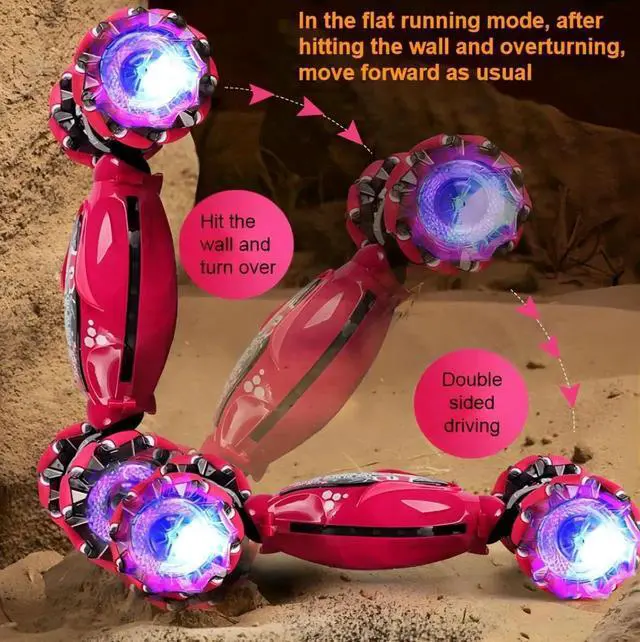 Double-Side Driving Car Unique double-sided driving design, super strong anti-collision structure, roll over and drive by both sides easily. Keep driving and climbing even if encounter obstacles. Features of climbing, twisting, moving forward and backward, automatic demonstration 360 ° rotation, four driving forces, night light, music, gesture sensing remote control, drift.