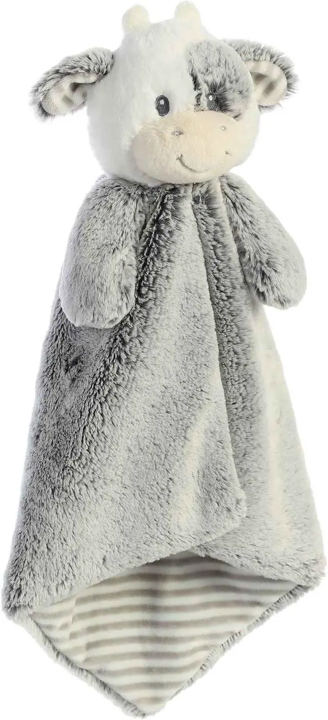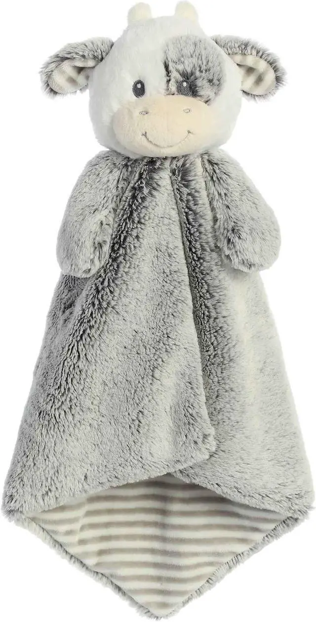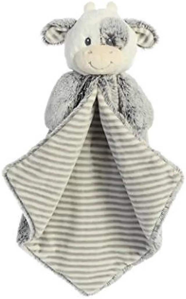Cuddlers feature adorable and snuggly animal friends each unique to their own color, style, and pattern. This Luvster Coby Cow is designed with a two-toned grey fabric and striped pattern on the inner part of the blanket. Soft and cuddly, your child will feel safe and comforted folded between a unique blanket accompanied by a cute stuffed animal.