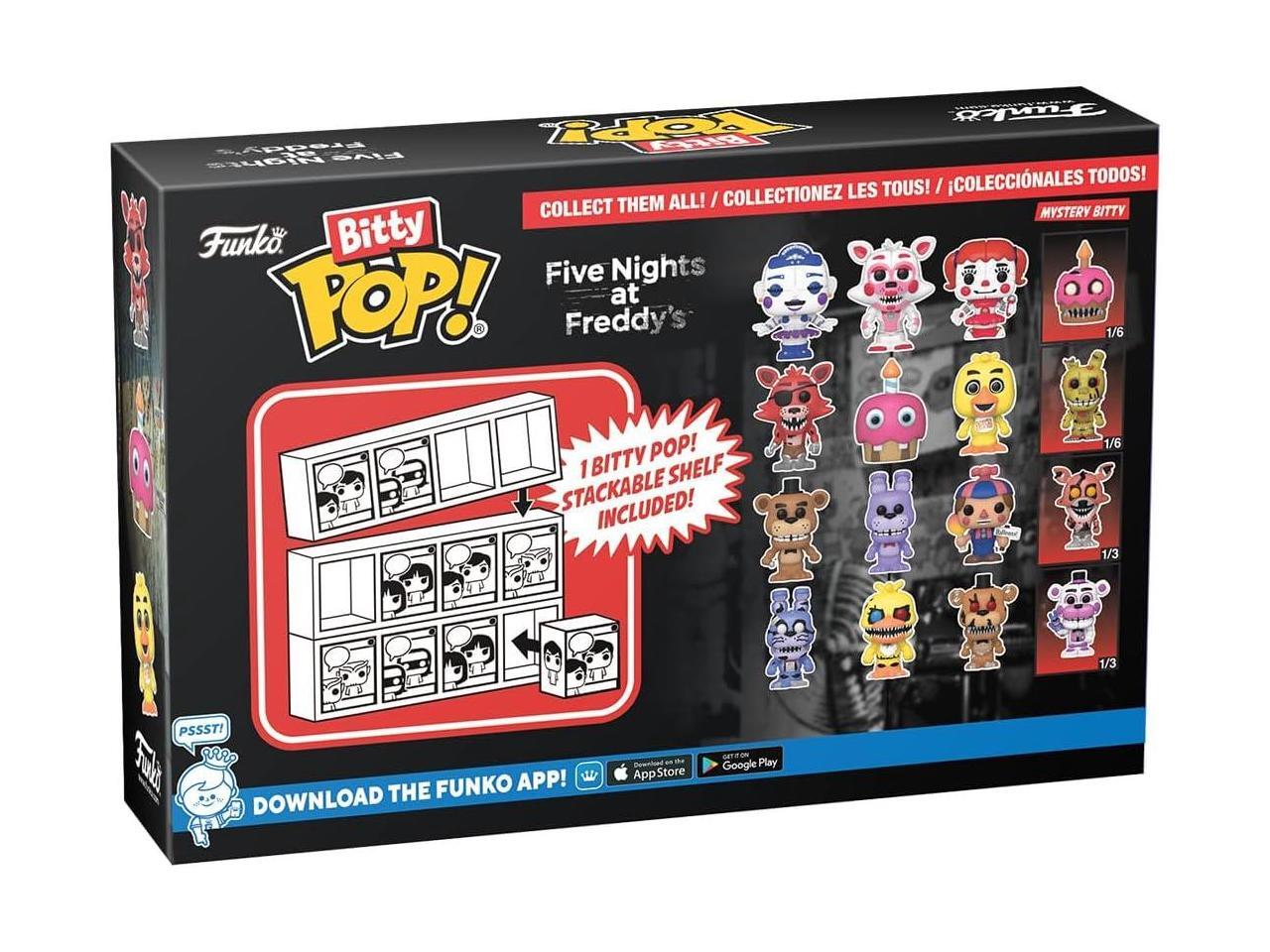 FUNKO MINI Set with Bitty Pop Freddy, Bitty Pop Bonnie, Bitty Pop Balloon Boy, and a mystery Bitty Pop figure. 4 figures per pack..