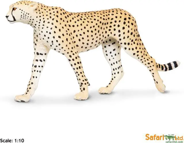 WARNING: CHOKING HAZARD -- Small Parts. Not for children under 3 years. DescriptionAs the world's fastest land mammal, the sleek, spotted Cheetah walks swiftly as it stalks its prey. Our largest replicas are found in the scale-model Wildlife Wonders collection, which recreates the world's most beloved large animals in jumbo-sized, yet lightweight and soft toys. Like all Safari Ltd figures, these are professionally sculpted for accurate detail and individually hand painted for realism that inspires imaginative play. The scale of this Cheetah is 1:10.