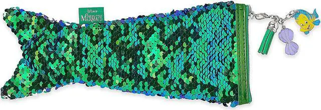 They'll be excited to make this Ariel pencil case part of their world. Inspired by the little mermaid's tail, the design features reversible sequins that change from an iridescent blue green to silver. The detachable zip pull includes a Flounder charm. Genuine, Original, Authentic Disney Store. Swipe sequins to switch from iridescent blue green to silver. Zip closure and detachable charm zip pull