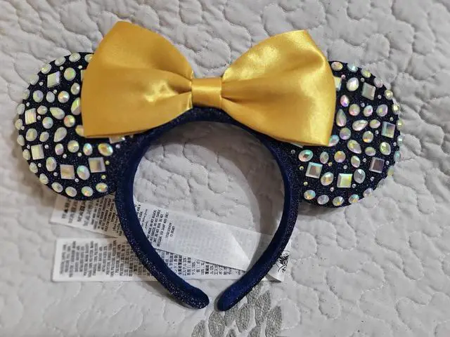 Behold the shine! Bedazzled Minnie Mouse Ears featuring a slew of gems on the ears, and a golden bow, felt on the inside of the band so they don't slip off all day, and golden stitched on words "Walt Disney World 50".
