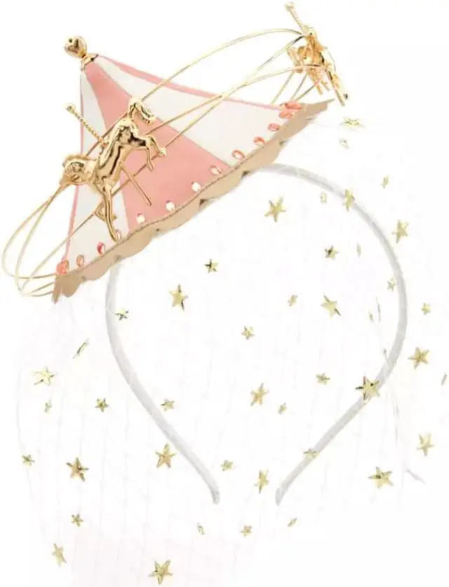 Celebrate the iconic Magic Kingdom and Disneyland with this stunning Disney King Arthur's Carrousel Whimsical Headband. As unique and beautiful as they come, this headband features gold tone horses, pink and white faux leather tent, heart tent topper, and a veil covered with golden stars.