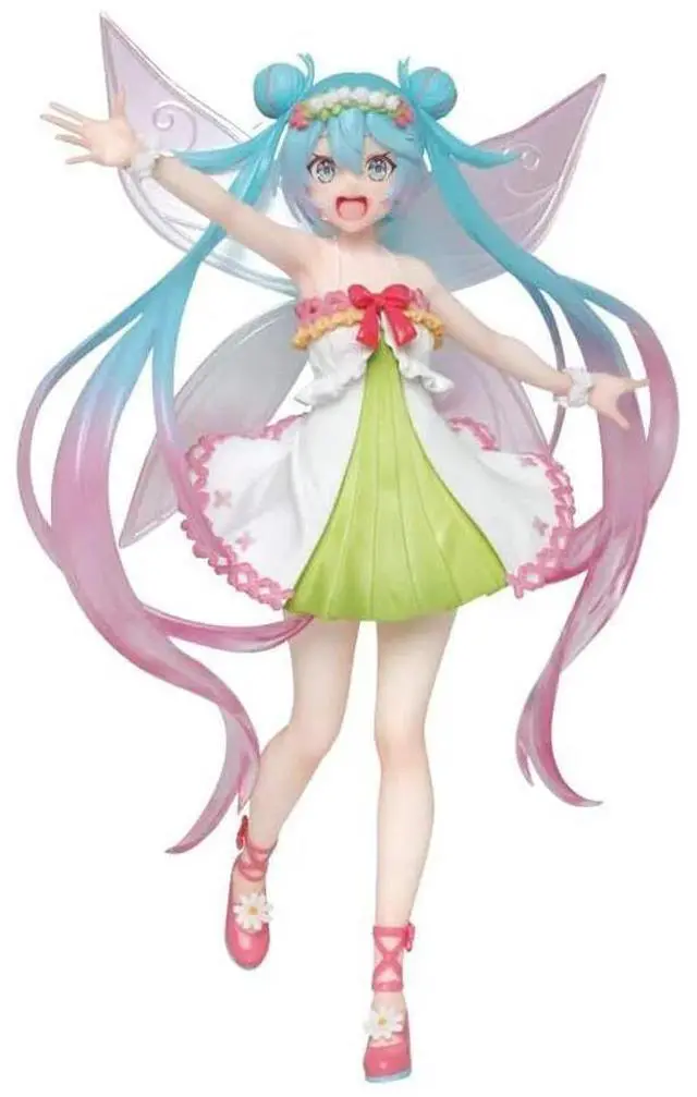 Taito is happy to present a new prize figure of Hatsune Miku in a flowing and cute outfit! Taken from the Illustrations by Syugao, Miku?s hair is adorned with a flower tiara and the tips of her hair end in translucent pink. With her excited expression her entire outfit is accessorized with flowers and bows, her seasonal look is completed with translucent fairy wings in the same colors as her hair.