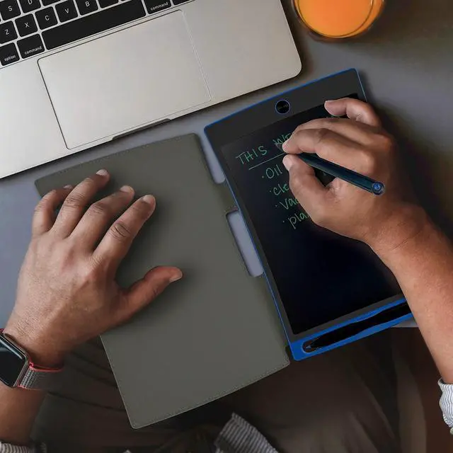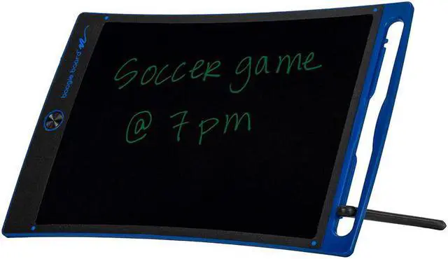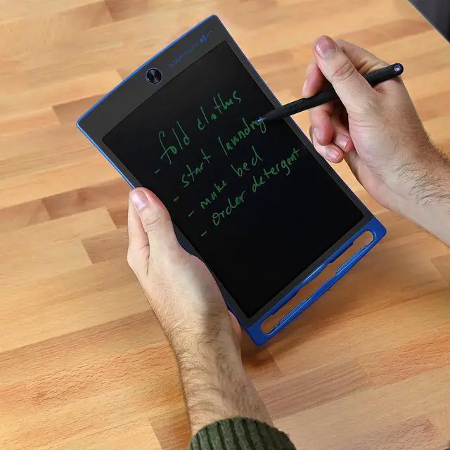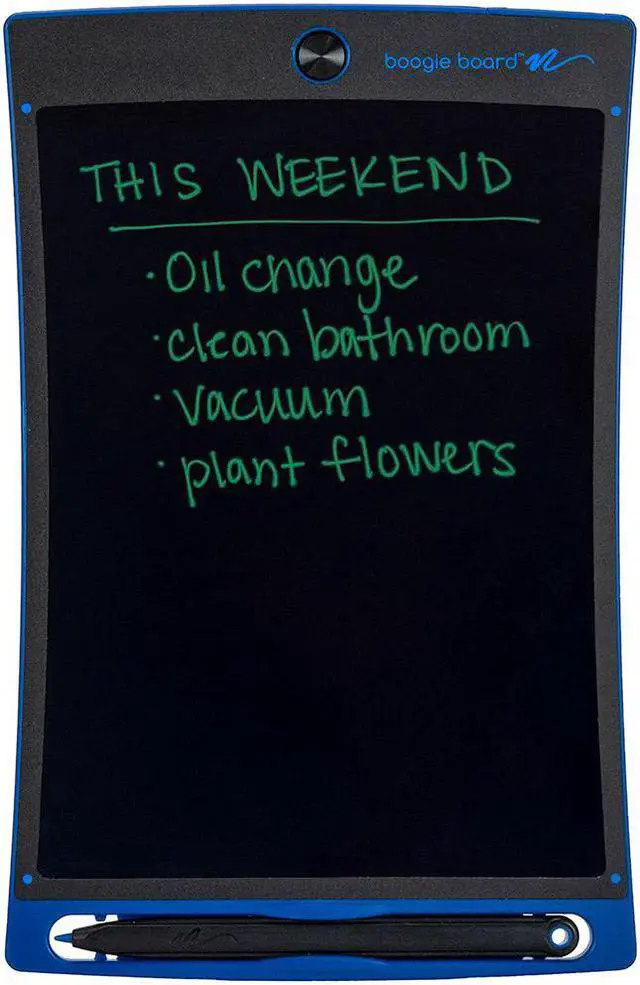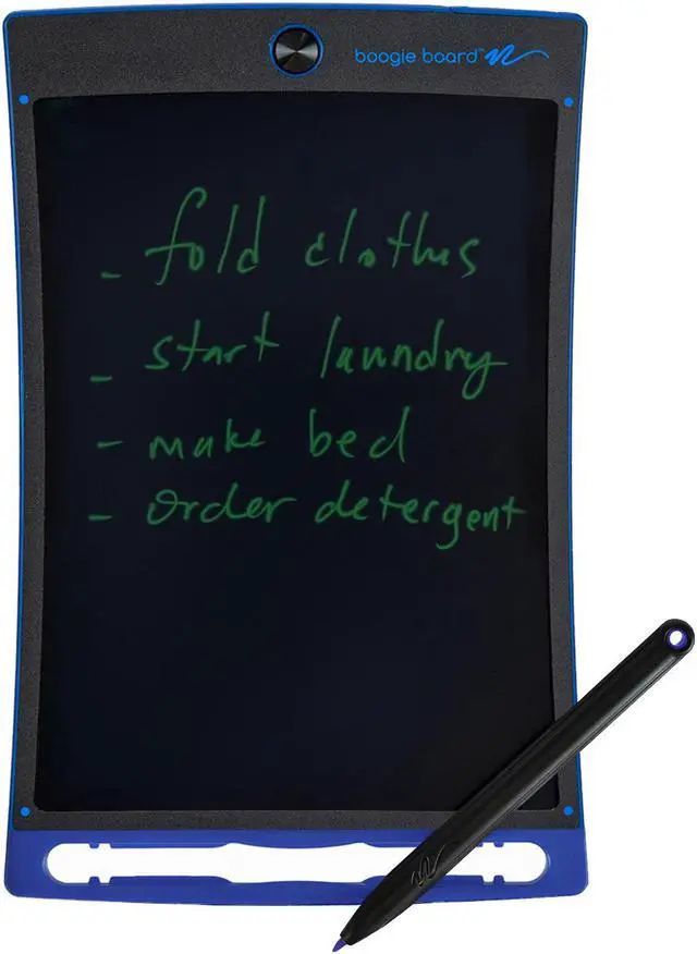 Jot is the best-selling reusable writing tablet with an 8.5" screen that is great for jotting down lists, reminders, playing games with the family, and so much more! Because the writing tablet uses Boogie Board's patented technology, you can write with the included stylus or anything you have on hand. When you're ready to erase, just push the button and the writing tablet clears itself using QuickClear technology. No more erasing or wiping.
