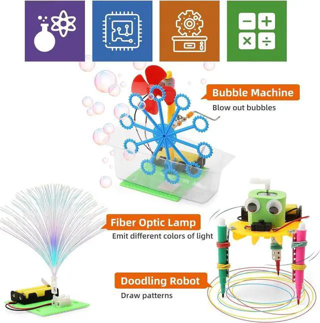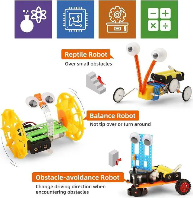 Set STEM Robotics Kit: This STEM Toys for 10 Year Old Boys includes a bubble machine, a doodling robot, a balance robot car, a fiber optic light, a reptile robot, an obstacle avoidance robot car and motor kit needed by these stem robots for kids ages 8-12.