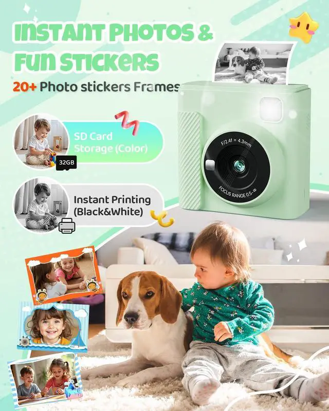 VERSATILEPRINT CAMERA: Our kids print camera is packed with features such asphotography, video recording, black-and-white printing, fun frames, music,games, a flashlight, and more. It caters to the diverse entertainment needs ofchildren and guarantees endless fun.