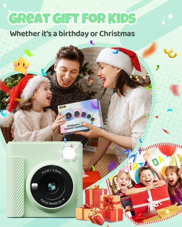 PERFECT GIFT FOR CHILDREN: This toy camera isn't merely a toy; it's a doorway to boundless creativityand joy. Ideal for Christmas, New Year, holidays, birthdays, family gatherings,and other special occasions, this instant print camera will charm boys andgirls aged 3 to 12.