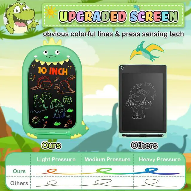 WRITING TABLET FOR KIDS WITH UPGRADED SCREEN ?The screen of this toddler toys drawing tablet has no blue light and no radiation, great for long-term use! ?Compared to the old version, our kids games doodle pad has a 50% brighter screen, which is clearer and more colorful. ?This boys toys age 4-5 uses new pressure-sensitive technology, allowing kids to draw colorful lines in different thicknesses by applying varying pressure.