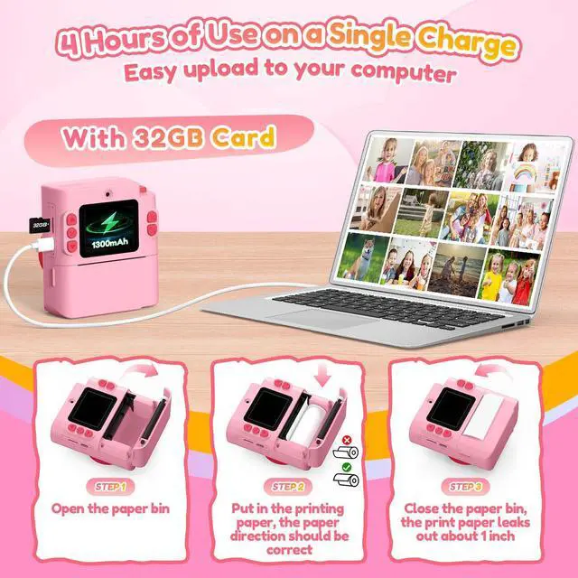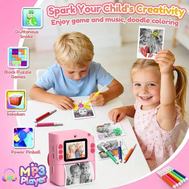Camera for Kids with Instant Prints: Using thermal inkless fast print technology, the ink never runs out. This kids camera is a more cost effective solution for kids.And the digital print camera also works with colored thermal papers (Not included, requires separate purchase). Optimal birthday gifts for girls. See the excitement on kid's face when printing what they have captured in 3 seconds!