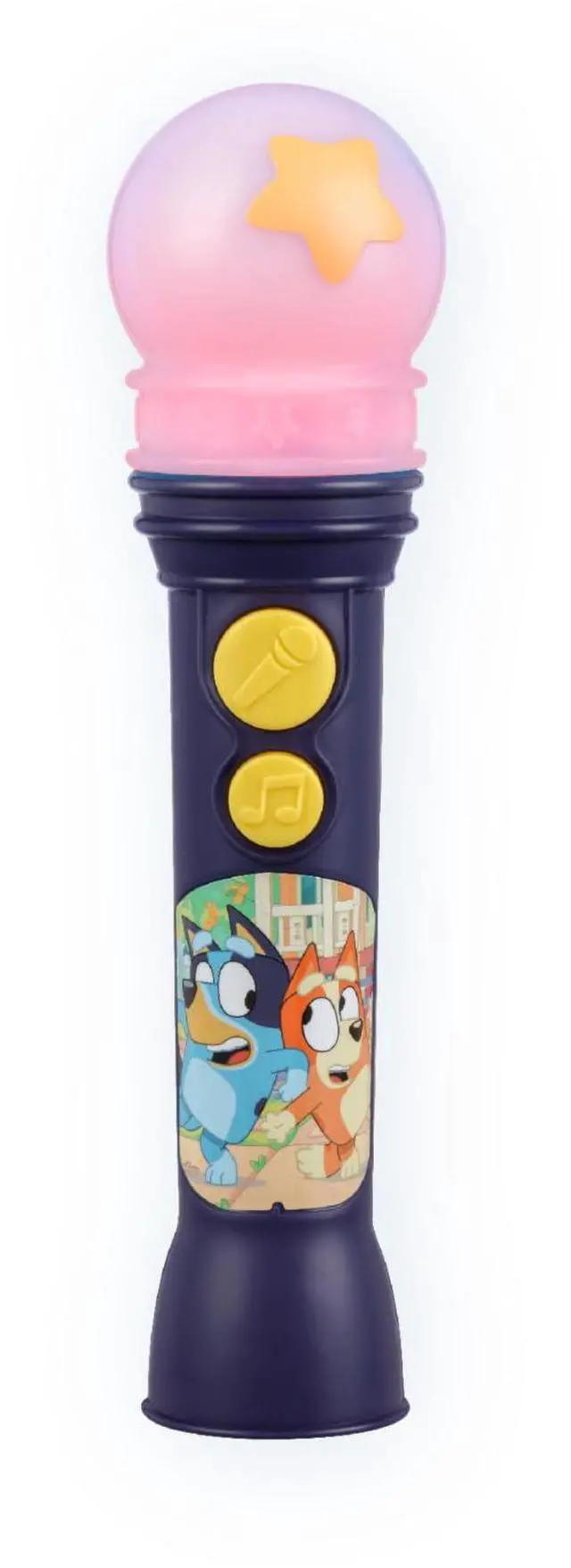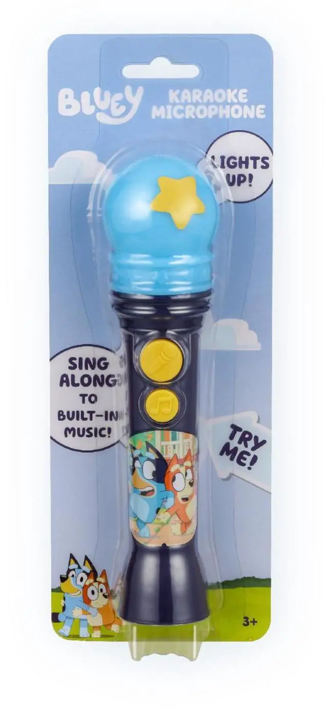 Steal the spotlight with this adorable toy microphone inspired by Bluey! Sing along to the built-in music while flashing lights add to the fun. With cute and colorful graphics, this real working microphone makes a great gift for any toddler who loves to sing, dance, and perform!