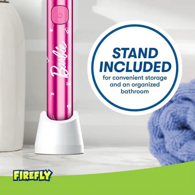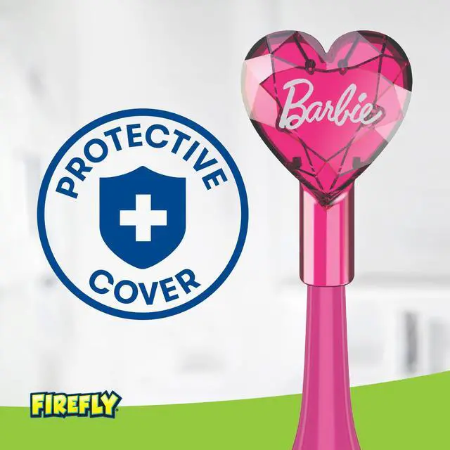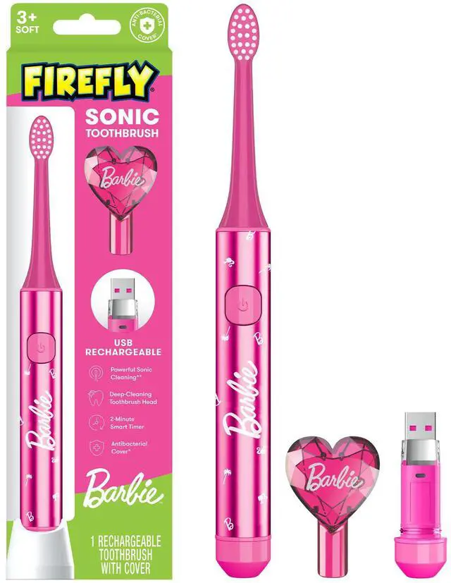 Introduce fun and effective oral care into your childs routine with the Firefly Sonic Rechargeable Barbie Toothbrush. This electric toothbrush is designed for kids 3 years and above and features powerful cleaning technology in a fun Barbie theme. The Firefly Sonic Barbie Toothbrush features powerful sonic technology paired with a brushing timer that helps clean effectively. The soft, multi-level bristles are gentle on the gums while providing a powerful clean that's superior to a manual toothbrush*. For parents concerned about hygiene, the Firefly toothbrush comes with a 3D antibacterial cover which contains silver to naturally inhibit bacterial growth to protect the cover. This feature ensures the toothbrush remains clean and safe for use, whether at home or on the go, making it a reliable choice for parents and fun for kids. *vs. Untimed brushing with a manual toothbrush Convenience is key with the Firefly Slim Sonic Rechargeable Barbie Toothbrush. It integrates a USB charger for easy charging, ensuring this Barbie electric toothbrush is always ready for use. The toothbrush can be used whether at home or on the go, making it a reliable choice for parents and fun for kids. The inclusion of the Smart 2-minute timer function with 30-second interval reminders to switch cleaning zones encourages children on the importance of brushing for the dentist-recommended time, promoting good oral hygiene habits from an early age. With the Firefly Sonic Barbie Toothbrush, kids will not only embrace their daily brushing routine but also look forward to it.
