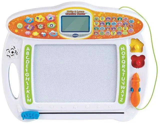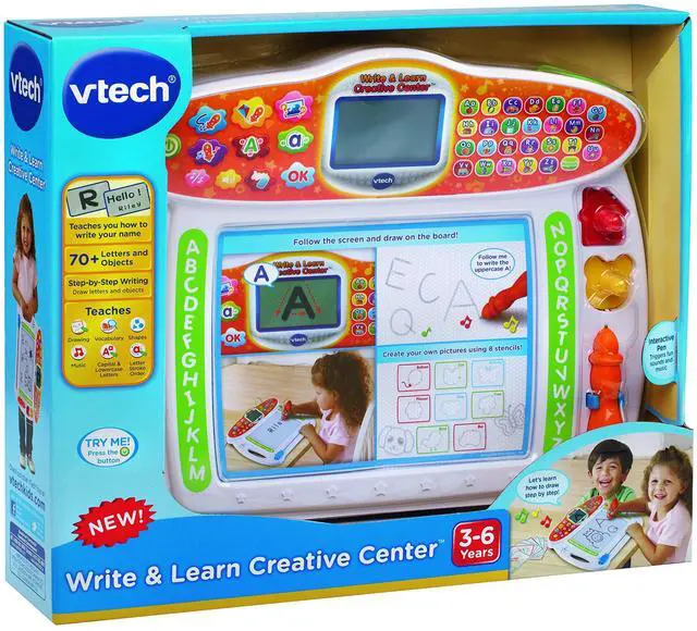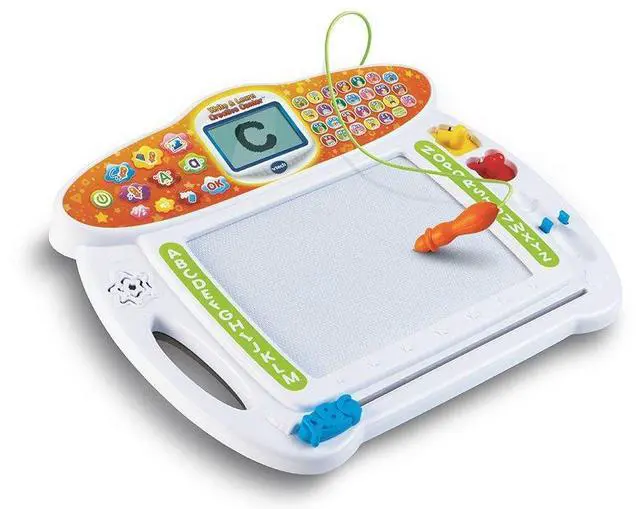 | Product Description | This interactive board teaches kids how to print letters, draw objects and write their names step-by-step. | Three-in-one desk with interactive activity cards that's expandable for more fun and discovery! Choose from eight expansion packs (each sold separately). | Enhance learning and get kids excited about everything from counting to reading through touch-and-talk games, puzzles, creative challenges and more. | This multi-function, kid-friendly smartwatch features a stylish design sized just for kids, two quality cameras for selfies and videos, a fitness tracker and more. | This fun, interactive easel can be transformed from a light-up dry-erase board to a chalkboard and drawing table for a variety of ways to learn and be creative. | Have fun writing letters, numbers and more with Mr. Pencils Scribble and Write! |
