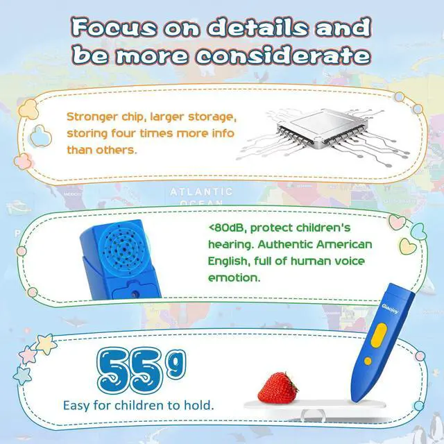 | Language Swich | The kids world map including Spanish and English and the pronunciation is very accurate. |