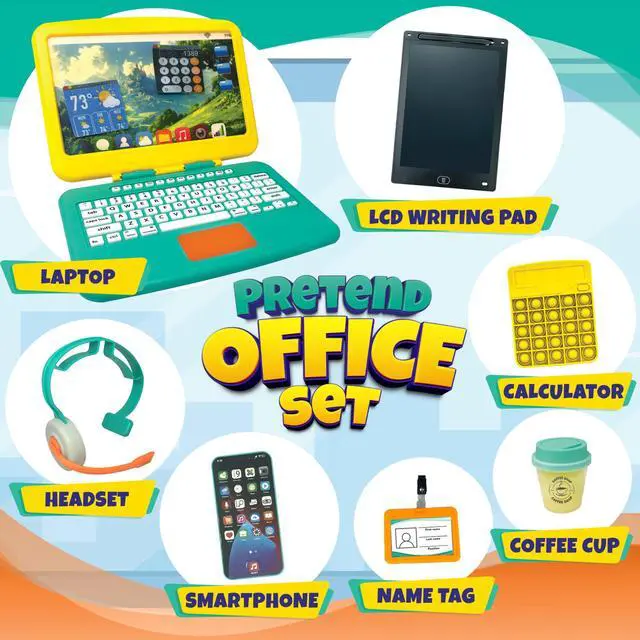 This 8-piece pretend office play set includes a toy laptop, LCD tablet, smartphone, calculator, name tag, headset, and coffee cup — all designed for imaginative play and learning. The perfect office playset for kids who love pretend work and creative exploration.