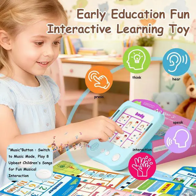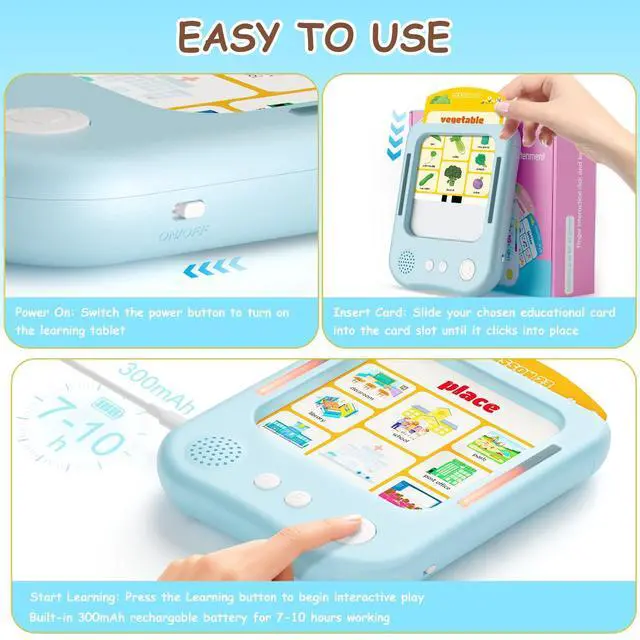 Touch, Think & Listen 3 Ways to LearnCard Mode: Insert 30 daily-life themed cards (animal,letter,shape,body,number,food etc.) for interactive Q&A. Music Mode: Play melodies with 5 adjustable volume levels. Crafted from high-quality ABS material, this educational tablet is built to withstand everyday play while remaining lightweight for little hands. With just 2-3 hours of charging, it delivers 7-10 hours of continuous playtimeperfect for all-day learning adventures at home or on the go!