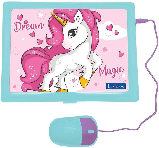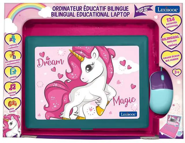 This cute educational laptop will please every young children. They will love to learn while playing with Unicorn ! Light and compact, this educational laptop can be easily carried everywhere. Finally, it is the perfect toy to pretend to work on a computer thanks to its realistic shape and sounds!