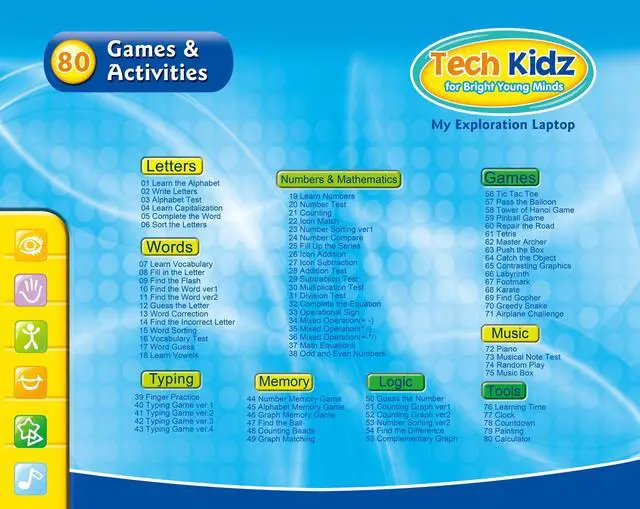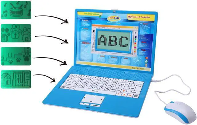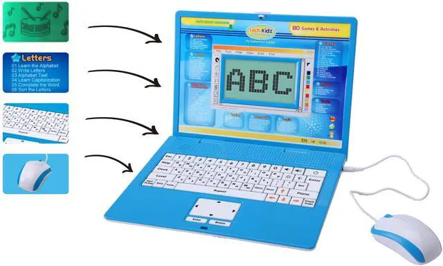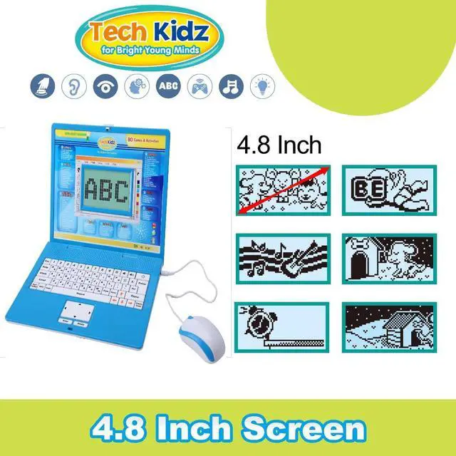 Bring advanced educational learning everywhere you go with the most advanced and cutting edge toy learning laptop in the marketplace! The Tech Kidz My Exploration Laptop comes bundled with 80 challenging educational learning games and activities!. This most state-of-the-art, fully loaded kids laptop allows you to play 80 math (3 levels of math difficulty), spelling, logic, memory, problem solving and music games! Placing hassle-free, no mess edutainment at your kids fingertips all of the time! No more fuss with installing software and trying to make sure all the content is child friendly. Perfectly compact, the Exploration Laptop is convenient and portable for car or plane rides. The laptop comes equipped with a real standard keyboard so your child can begin to familiarize themselves with button placement and typing. The dual button mouse improves their fine motor skills and hand eye coordination. Give a child a gift that will start them on the path to a successful future!