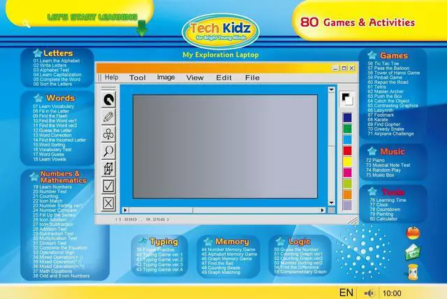 80 Challenging Learning activities which include math (3 levels of math difficulty), spelling, logic, memory, problem solving and music games