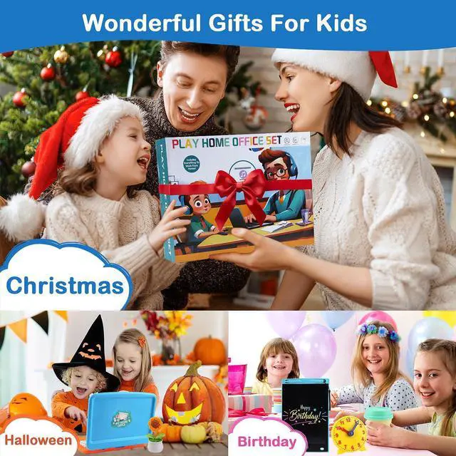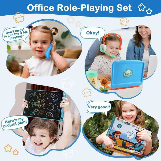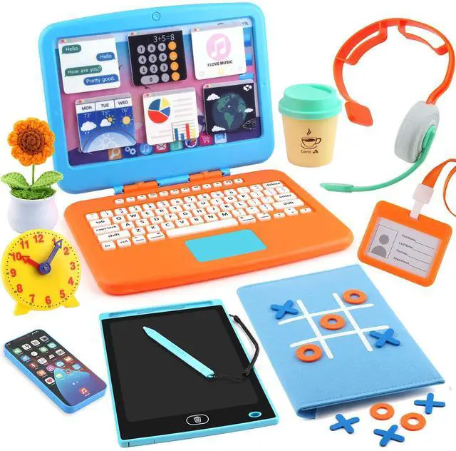 UNLEASH THEIR INNER CEO: Let imaginations soar with this complete toddler pretend play office set! Features a realistic kids laptop with clickable buttons and 6 Velcro Apps, smartphone, LCD writing tablet, headphones, coffee cup, sunflower, clock, tablet case, ID card and more, everything for realistic career roleplay!