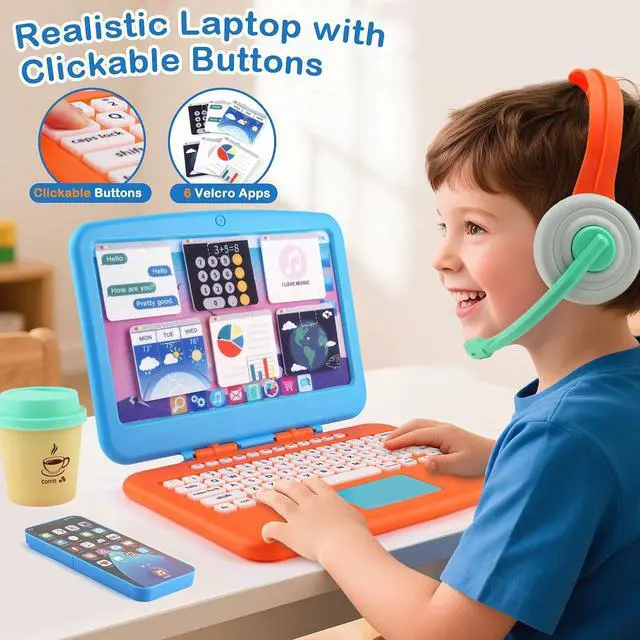 HIGH QUALITY, REALISTIC DETAILS: Our toddler playset is crafted from durable materials, ensuring long-lasting play. The laptop folds up and features a keyboard with letters A-Z and numbers 1-10. It comes with six velcro "apps" that can be easily attached and removed. The fake headset with a microphone is designed to resemble real devices. Every detail is carefully designed to be realistic, enhancing the experience for children.