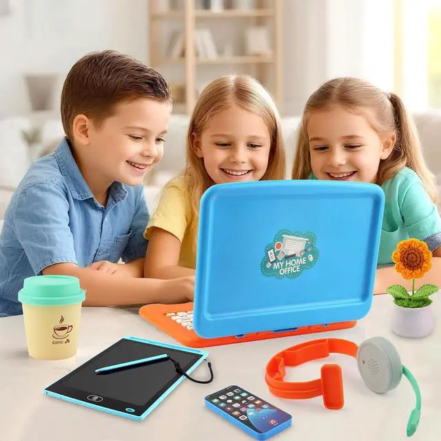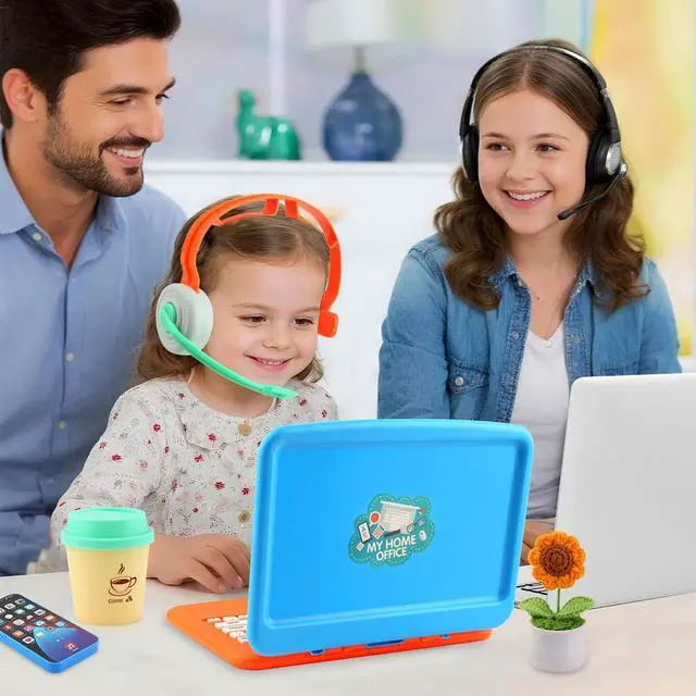 Pretend Play Home Office Set for Kids, Features Toy Laptop Computer, LCD Writing Tablet, Toy Phone, Headset, Sunflower & Coffee Cup, Toys Gifts for Boys Girls Age 3-5-7