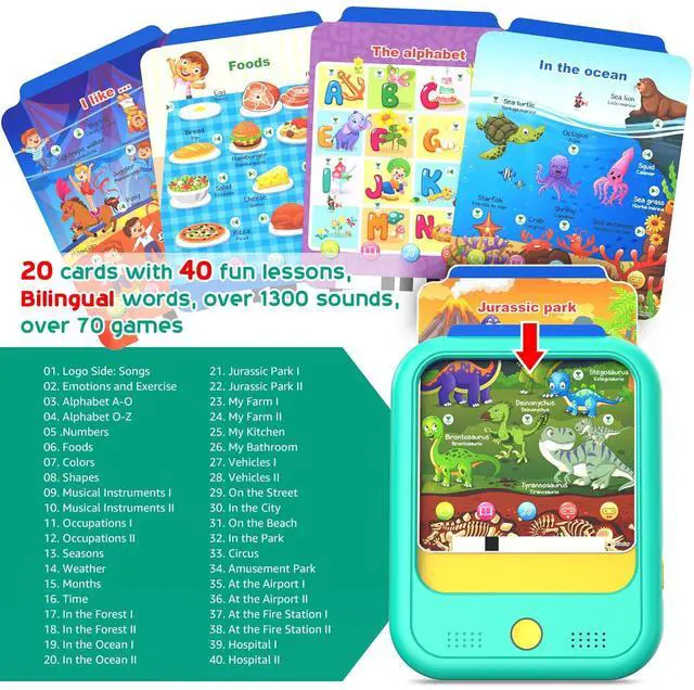 Additionally, it provides them with an engaging way to explore topics such as letters, numbers, food, professions, weather, seasons, transportation, the ocean world, and Jurassic Park etc.