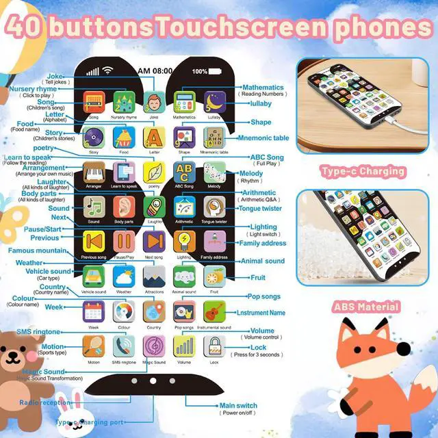 Educational FunThis toddler learning phone packs 40 functions & 10,000+ educational content including ABCs, numbers, songs, Magic Sound, weather, body parts, fruit, animal and animal sounds. Enrichment promotes early development in infants and toddlers.