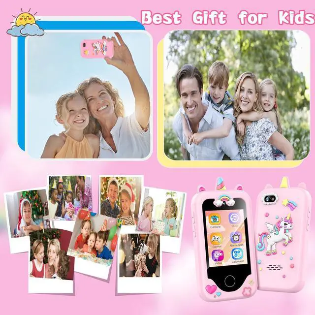Multifunctional Kids Smart Phone:The upgraded touchscreen kids' cell phone comes with various features, including a selfie camera, MP3 player, games, paint, voice recorder, country and daily guide, alarm, flashlight, stopwatch, calculator, theme and screensaver selection, time format, volume control, and more. It offers convenience, fun, and a new experience for kids ages 4-12.