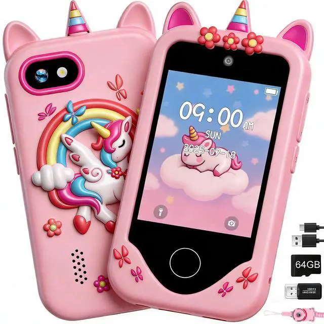 Kids Smart Phone for Girls, Touchscreen, 64GB Card Birthday Gifts for Girls Age 3, 4, 5, 6, 7, 8, 10 Year Old, Toddler Educational Learning Toys Phone with Dual Camera, Game, Music Player