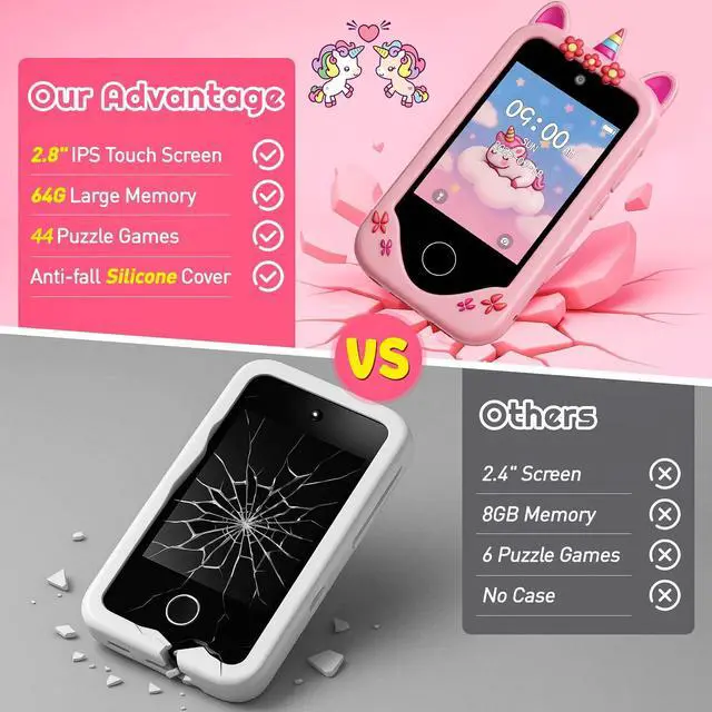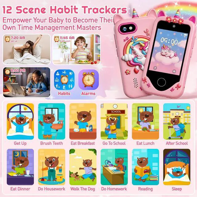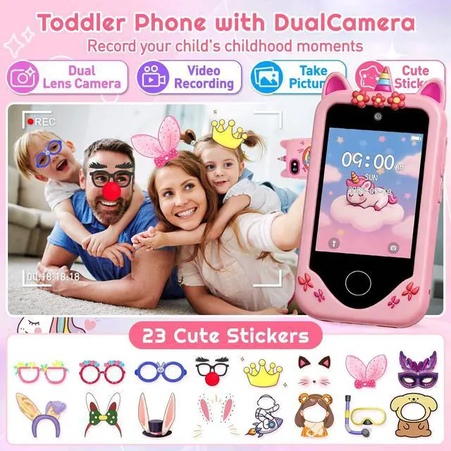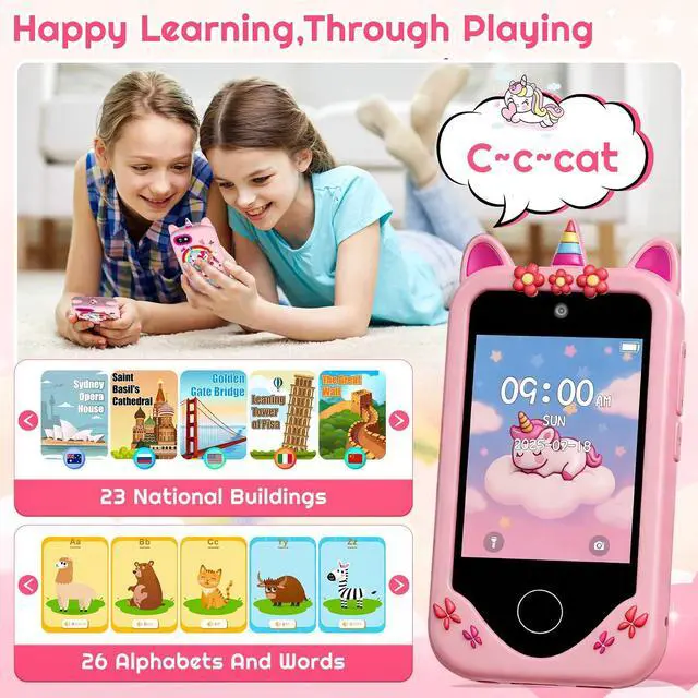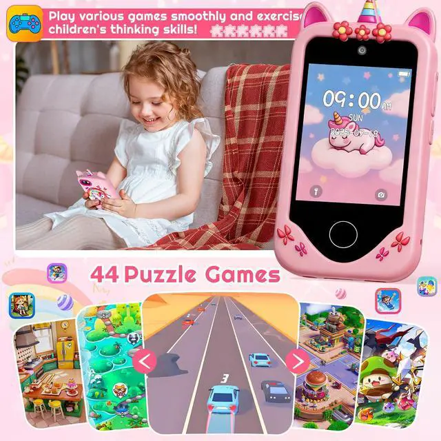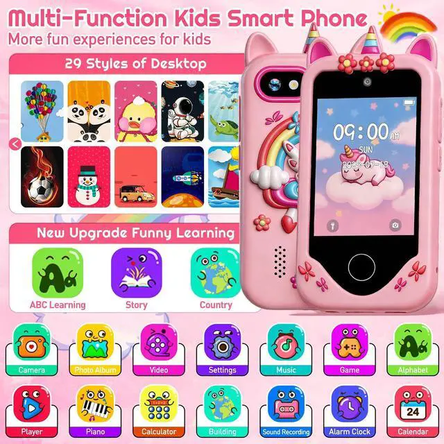 Multifunctional Kids Smart Phone Our kids toy phone offers a wide range of applications and features designed to entertain and educate. Kids can take photos and videos with dual cameras, learn interestingly, cultivate habits, listen to music and stories, and play games. Ideal for boys and girls