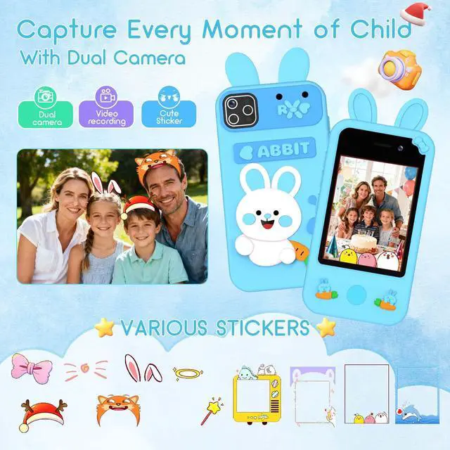Dual Cameras for Fun Shots - Dual cameras (front/rear) let kids take photos, record videos (120 mins max), and add cute stickers. Switch easily between selfie/filter/split-screen modesno WiFi needed. Includes 32GB TF card (supports up to 128GB) for storing their creations.