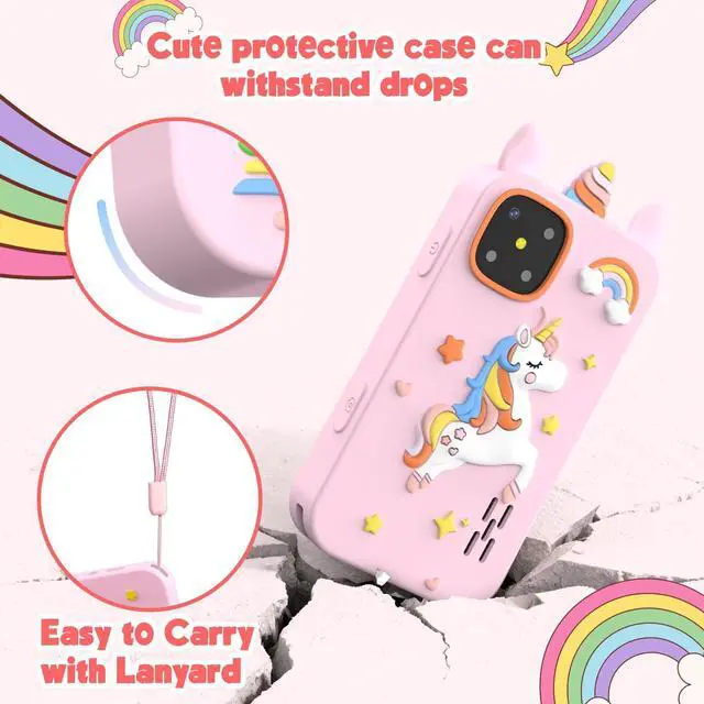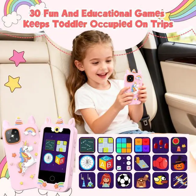DUAL CAMERAS & CUTE STICKERS: Kids toy phone has dual cameras for selfies and videosand has 15 super cute stickers so she can play around with her photos, perfect for little photographer to explore their creativity