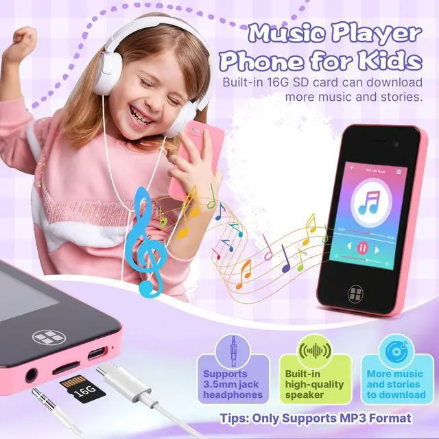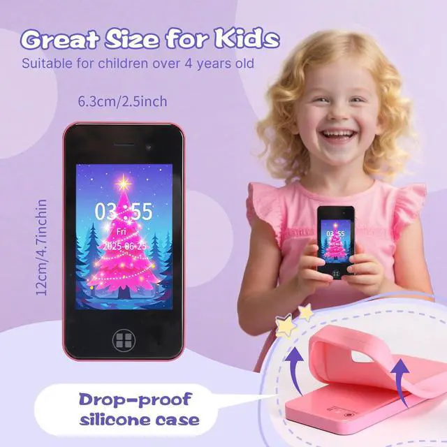 Multi-functional Kids Toy Phone: The kids smartphone is equipped with a 2.8" touchscreen and has a variety of functions, including a dual camera, MP3 player, games, voice recorder, habits tracking, alarm, flashlight, stopwatch, calculator, theme, music, stories, etc. It offers convenience, fun, and a new experience for kids ages 4-12. The pretend cell phone is a good toy loved by kids ages 4-10 years old but also a practical tool for kids' daily life.