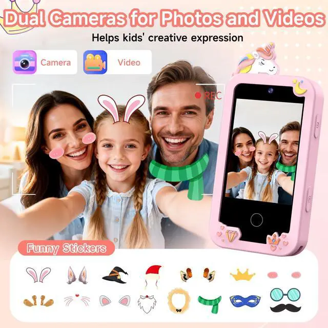 Front and rear cameras let kids take photos, record videos, and add funny stickers for creative play. They can view and replay their memories anytime, sparking imagination and building confidence, just like mom and dad’s phone, but kid-friendly.