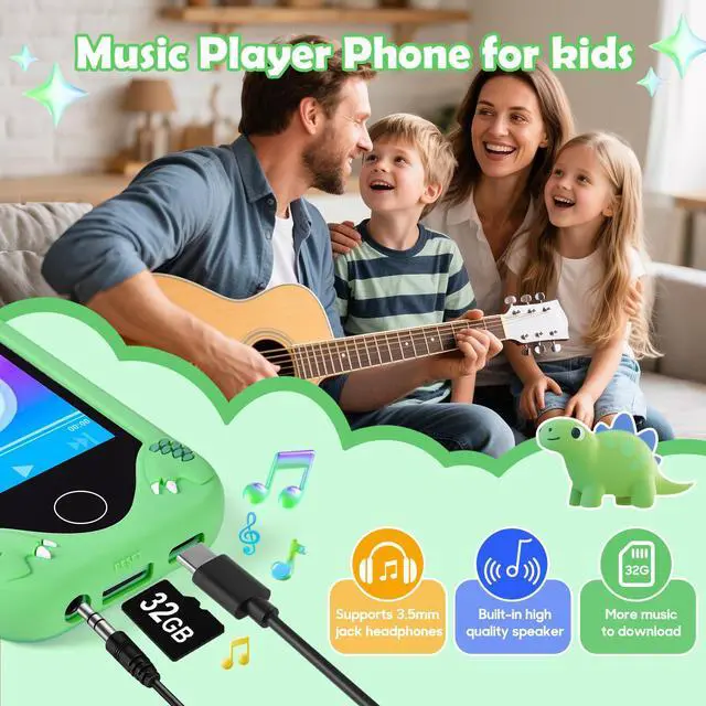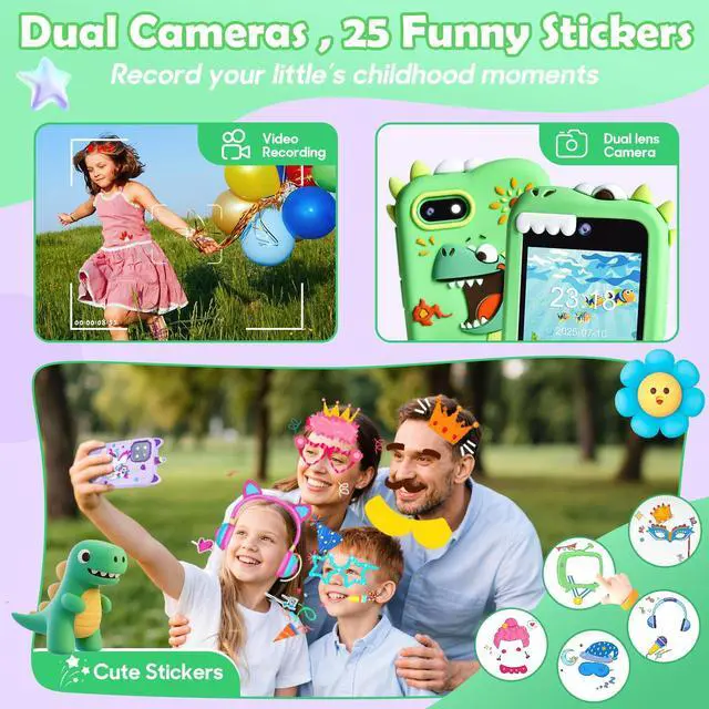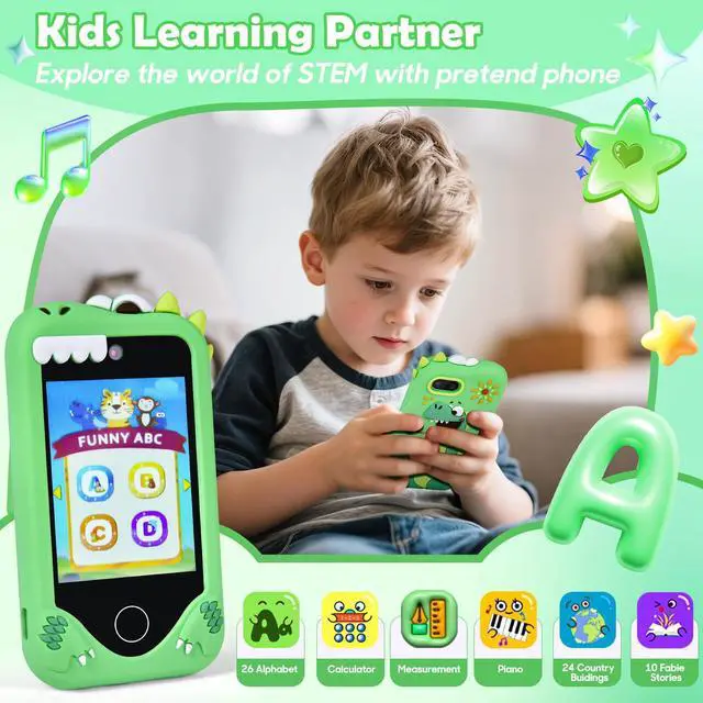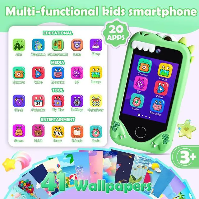 Full of Fun & FunctionsThe upgraded touchscreen kids' smart phone packed with selfie camera, music player, games, voice recorder, alarm, flashlight, stopwatch, calculator, Ebook, themes & more just like a real smartphone! 40+ wallpapers & 22 screen themes for your little one to choose. Cute dinosaur designs, kid-safe silicone case, And mini toy phone size(10*6.5cm) is perfect for kids and handy