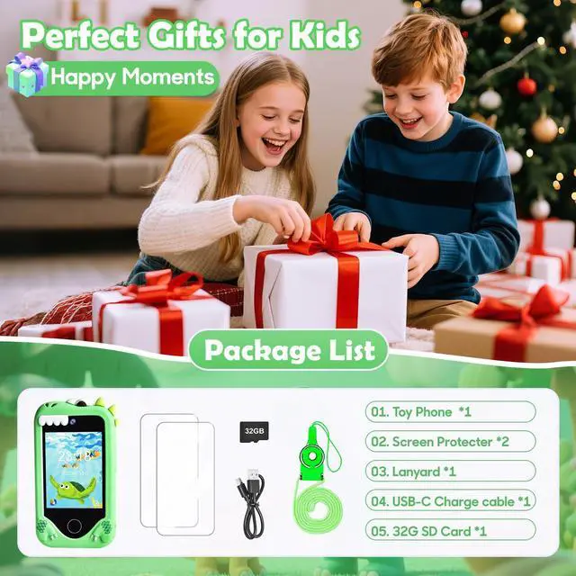 Kids Smart Phone for Boys, Dinosaur 2.8 Touchscreen Toy Phones Christmas Birthday Gift for Boy Ages 3-9, Toddler Play Learning Cell Phone with Dual Camera, Game, MP3 Player, 32GB Card, Green