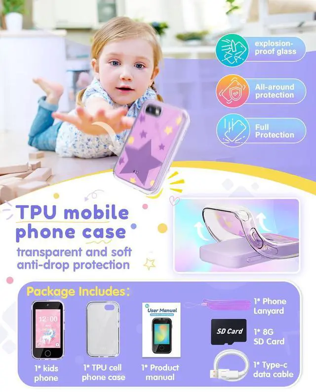 - Package Includes: 1* Kid's phone toy , 1* Transparent cell phone case , 2* phone protective films,1* Cell phone lanyard , 1* Type-c data cable , 1* Product manual