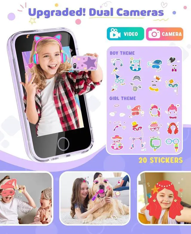 - Our kids smartphone has dual camera shooting, ABC fun learning, fun stories, habit tracking, music player, landmarks learning, fun games and other functions, learning and entertainment at the same time, give children experience more new things.
