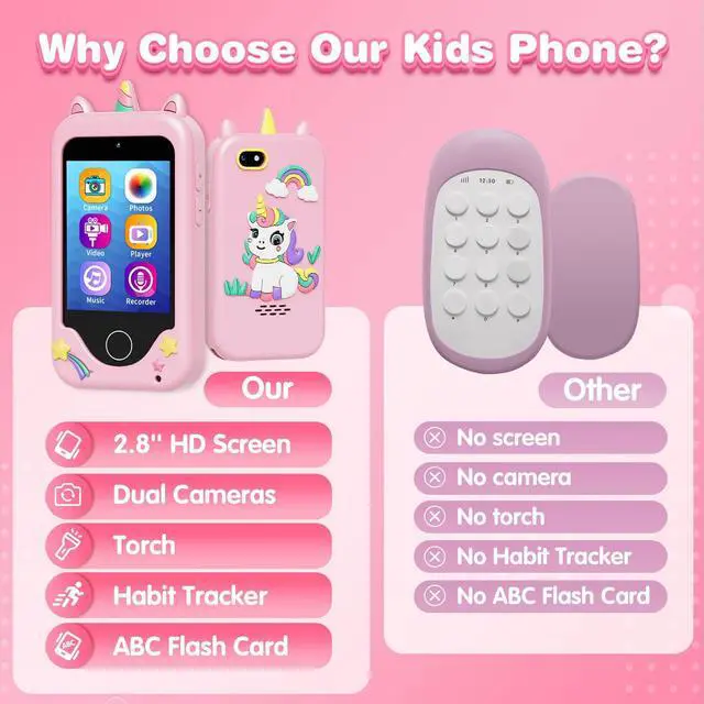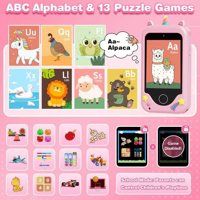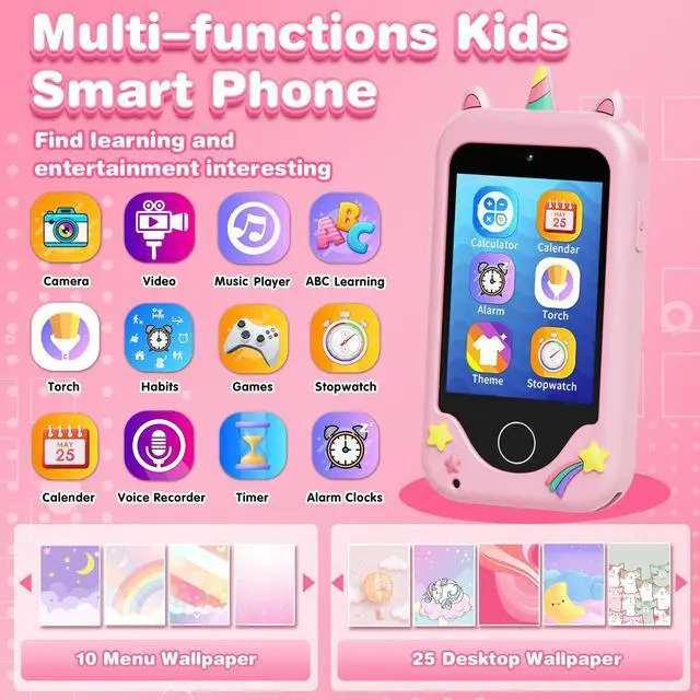 Yes, our kids smartphone comes with dual cameras, videos, music, games, habit tracker, alarm clock, ABCs and more fun features that kids will love! It's also sized to fit little hands. The best choice for children aged 3-8 years old.