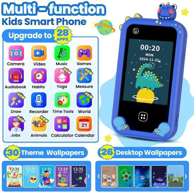 Designed for ages 3-8, this Kids Smart Phone is the ultimate toy phone packed with 28 apps to spark curiosity and creativity! The phone for kids blends education and play, featuring: