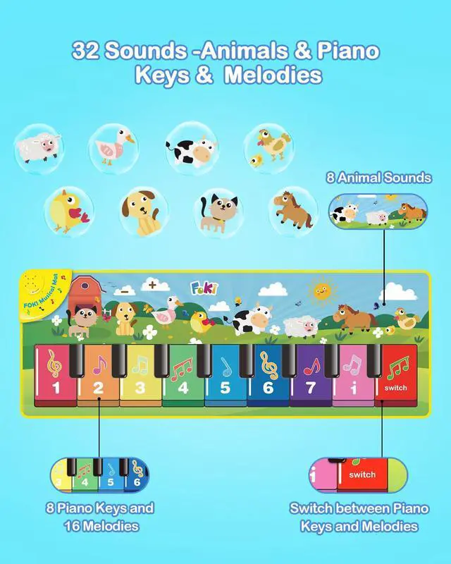 | Product Description | This mat with RECORD PLAYBACK and FIVE modes, which brings plenty of fun to keep child delighted and busy. The most unique mode that will definitely surprise child is every animal can really sing with built-in melodies, which we call "Chorus Mode"! | The 3-in-1 Musical Mat is farm themed with vibrant colors, 3-way speaker and 9 instruments effects, allowing 2 kids to trigger musical sounds simultaneously and recognize different instruments and animals sound, explore different melodies & rhythms. | Musical mat with FIVE modes, which brings plenty of fun to keep child delighted and busy. The most unique mode that will definitely surprise child is every animal can really sing with built-in melodies, which we call "Chorus Mode"! |