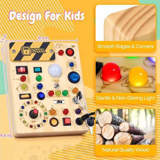 Great Montessori Toys: This interactive LED busy board features 13 unique switches and 24 vibrant LED lights, each triggering different colors and patterns for endless exploration. A convenient master switch allows one-click power-off to save energy. (Requires 2 AAA batteries, not included).