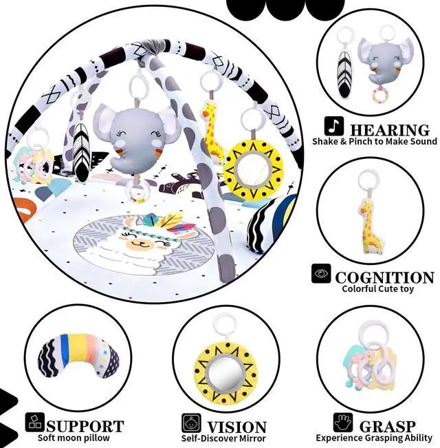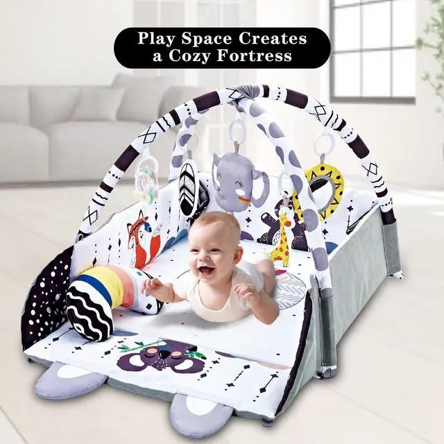 [Large Size Play Mat]: Our oversized gym play mat measures 39.4*43.3*21 inches. It's quick to set up and take down, features a foldable design for easy storage and portability, and is suitable for both indoor and outdoor use-giving your baby more space for happy tummy time and play.