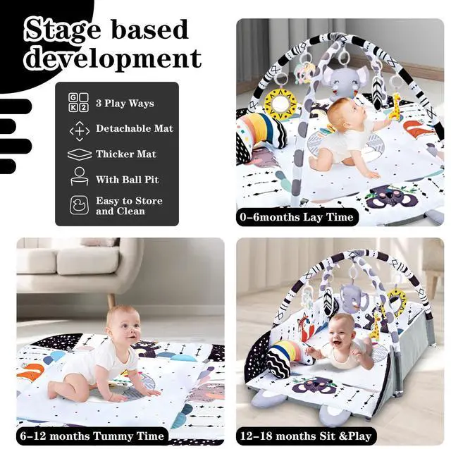 [8-in-1 Baby Activity Play Mat]: Designed for newborns and infants 0-6-12 months, our animal-themed 8-in-1 baby play gym supports tummy time, floor play, and early development from laying to sit-to-crawl stages. Includes 3 sensory baby toys (giraffe, tree, elephant) with sound effects, a self-discovery mirror, safe teethers, and a tummy time pillow to spark exploration, learning, and growth. Multiple play modes for every milestone. (Ocean ball not included)