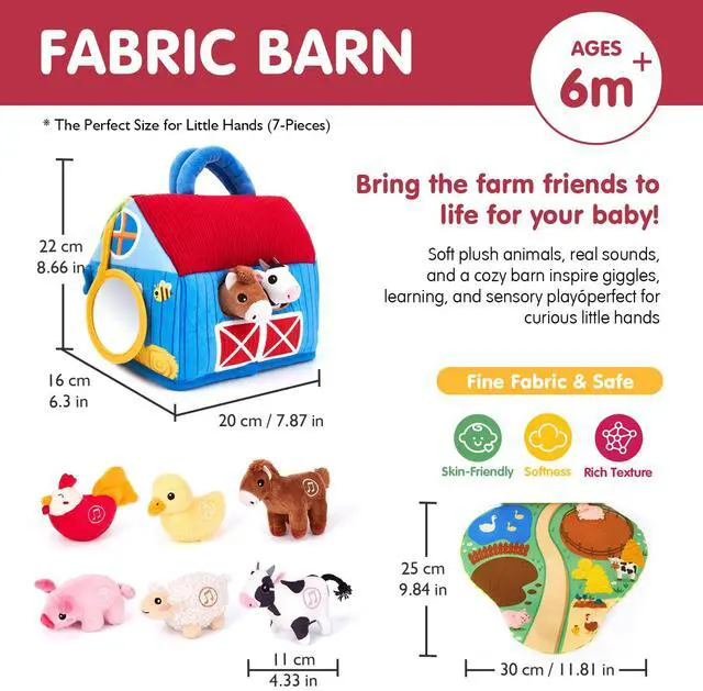 A PLAY MAT AND BARN IN ONE : Our innovative barn unfolds into a play mat, giving babies a cozy, colorful space to matching animals to homes. From stuff in & match to hide-and-seek flaps , this toy keeps little hands and minds busy. Babies improve hand-eye coordination, and object permanence learning, fine motor play, and problem-solving as they explore multiple ways to interact with the barn