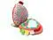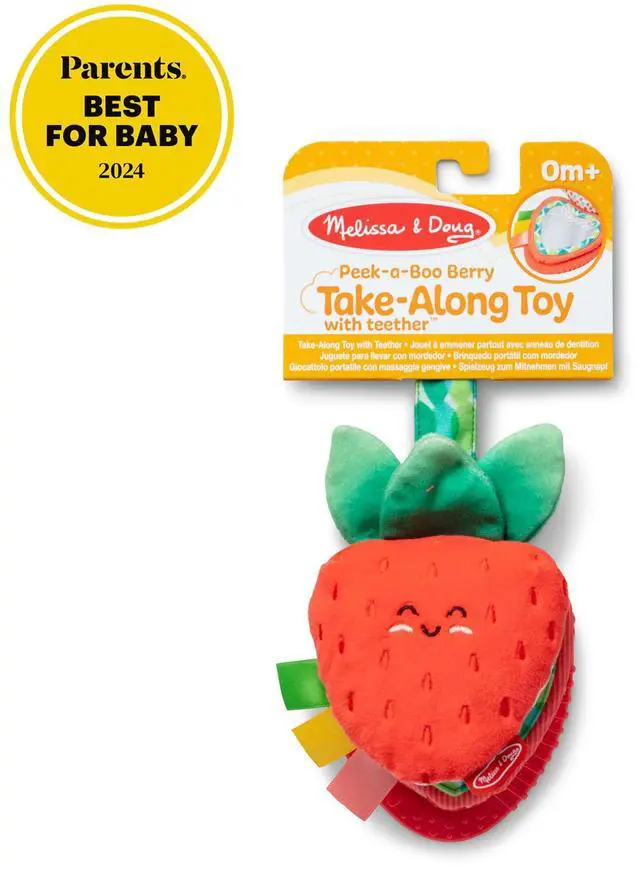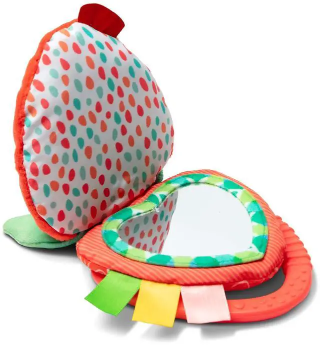 Includes 3 strawberry multi-textured slices with crinkling leaves, a peek-a-boo mirror, satiny ribbons, and a food-safe teething ring.